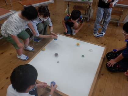 3年生の「こまブーム」がきています。色変わりごまや逆立ちごま、べいごまなど、いろいろなこまをみんなで楽しんで回しています。