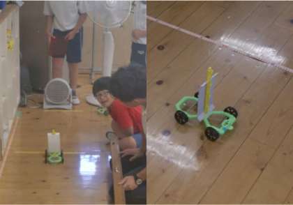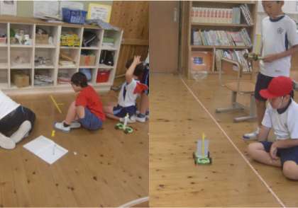 3年生の理科、初めての実験です。風の力で車がどれだけ進むかを調べました。送風機と車の距離を合わせて、実験をしました。