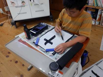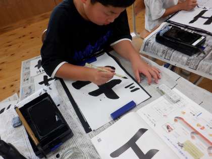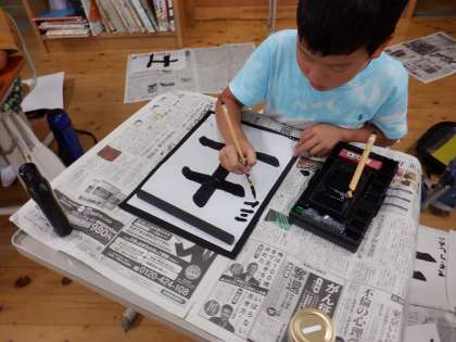 毛筆で「土」を書きました。たて画の筆使いに気をつけて丁寧に書いていました。