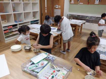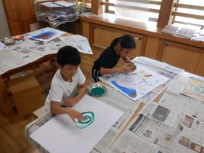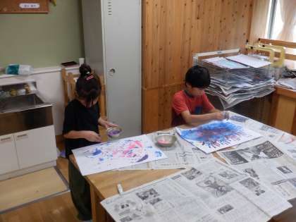図画工作「とろとろえのぐでかく」という学習をしました。いつも筆を使って絵を描きますが、今回は筆の代わりになるものは、なんと自分の手です。濃く書いたり、指をはじいて絵の具をとばしたりなど、手を使って様々な技法で描いていました。偶然重なった色がとても綺麗な色になっていたりして、みんなの気付きがとても素敵でした。