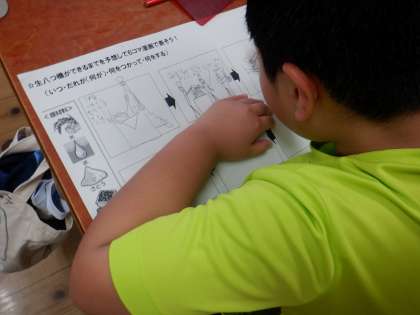 生八ッ橋ができるまでの過程を6コマ漫画で予想しました。原料をどのように混ぜ合わせるのか、どのタイミングで機械を使うのかなどを考えながら、6コマ漫画をかきました。次の時間からは、実際にどのように生八ッ橋が作られるのかを調べていきます。