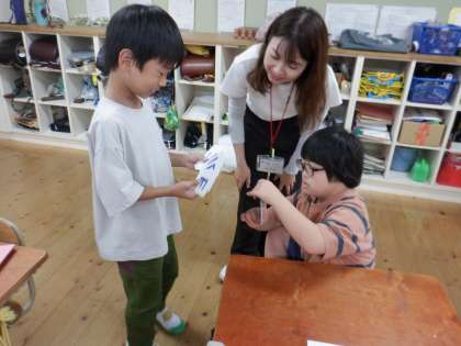 外国語ではアルファベットの学習をしています。今日は、同じアルファベットカードを集めるゲームをしました。“please A”“Here youare”といったフレーズを使いながら、友だちとアルファベットカードを交換していました。