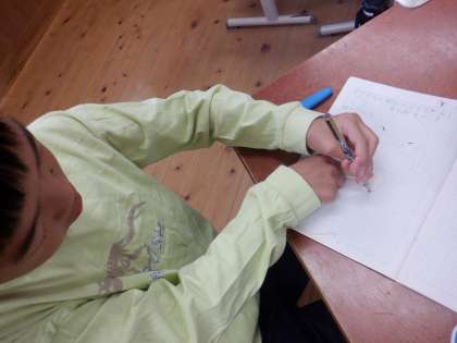 いろいろな方法で円をかきました。はじめは、コップや磁石など丸い形のものを使って円をかいたり、糸と画びょうをつかってかいたりしました。そのあと、コンパスを使って円をかきました。子どもたちは,「コンパスを使うとはやくきれいな円をかくことができる」と、コンパスを使うことのよさに気づいていました。