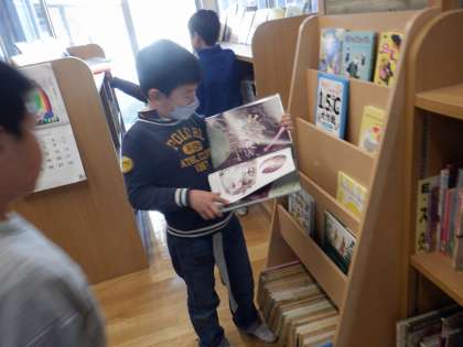 1年生に、「読書がもっと好きになる楽しい本」をおすすめする学習をしています。今日は、図書コーナーで探したり、司書の先生に相談したり、インターネットで調べたりして、どの本をおすすめするか一人一人決めました。