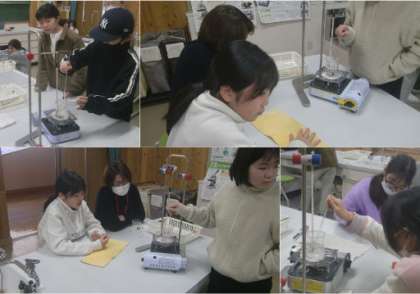 今回は、水よう液の温度を30度、60度に上げると、どうなるかを調べました。実験用コンロを使って温度を上げました。ミョウバンが温度を上げると、多くとけたのは、おどろきでした。