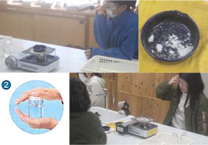今日は、ろ液を熱し、蒸発させて溶けたものが出てくるか調べました。蒸発皿にろ液を入れて熱すると、白い粒が出てきました。蒸発させて水分をなくすと、溶けていたものが出てきたのです。