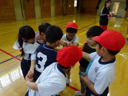 人間知恵の輪では、からまった手をほどくのに苦労していましたが、1年生も2年生も声を掛け合って頑張りました。ほどけた瞬間、歓声があがっていました。