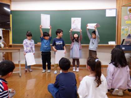 みんなで「小犬のビンゴ」を歌いました。「B・I・N・G・O」の札を持ち、札を上げているときは歌い、札を下げているときは手を叩きます。リズム感が大切になりますが、大きな声で楽しく歌っていました!!