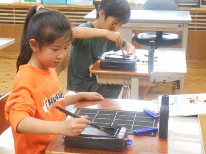 実際に書いてみると、「鉛筆と全然違う!」「難しい・・・。」と、色々な感想があふれていました。学習に取り組んでいく中で、力の入れ方や穂先の向きなど、硬筆との違いを楽しんでほしいと思います。