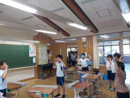 運動会当日の応援エールで踊るダンスを練習しています。一足早く練習を始めた4年生。明日、3年生の見本となるように頑張っています。