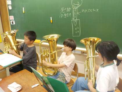 3年生が加わり、6年生が中心となって教えてくれています。高い音を出すこつを分かりやすく教えていたり、一緒に音を出したり。それぞれの関わる姿が、素敵でした。