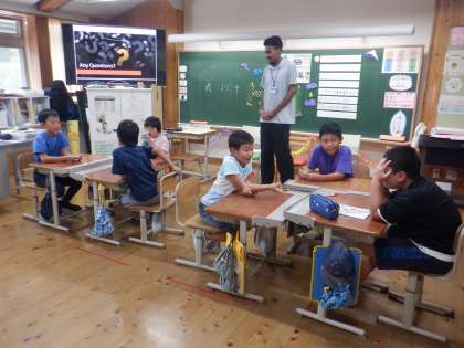 今日は、ライリー先生の自己紹介を聞いたり、尋ねたいことを質問したりしました。ライリー先生についてのクイズもあり、子どもたちは大盛り上がりでした。授業が終わってからも、質問しに行く子もいました。