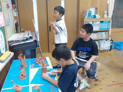 ねんどを高く立ち上がられよう!をめあてに、ねんどを切ったものを積んだりねじったりしたものを縄のようにして巻き付けたりしながら、ねんどを高く立ち上がらせました。最後に友だちの作品を鑑賞し、それぞれの工夫をみつけることができました。