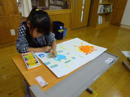 写真は、コンテで描いた線を大事にしながら、パスで丁寧に色を塗っているところです。たくさんの色をつかって、集中して塗っていました。出来上がりがとても楽しみです。