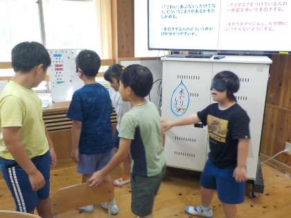 トイレや信号など、身近なところに「誰もがすごしやすい工夫」があることを学習した後、、実際にアイマスクをつけて教室や廊下を歩きました。