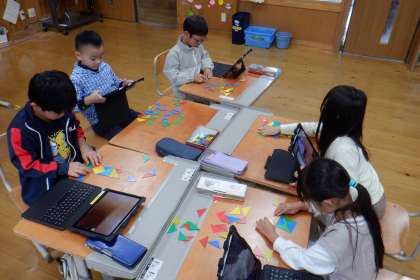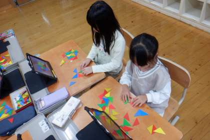 算数科「かたちづくり」の学習に入りました。本時のめあては「ならべかたをかんがえて かたちを つくろう」!色板を並べてオリジナルの形をつくって、つくり方を説明しました。おもしろい形をたくさんつくっていました。