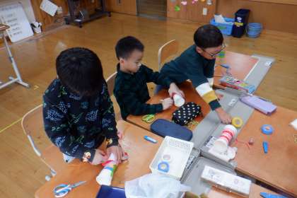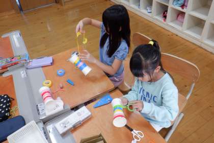 生活科「あきと ともだち」の学習で、どんぐりを使ってけん玉を作りました。どんなデザインにしようかな〜!とワクワクしながら作っていました。完成したけん玉で遊んで、プチ対決をしていました!