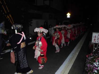 毎年踊り子は,八瀬小学校の講堂で着付けやお化粧などの準備をしてから,行列で秋元神社に向かいます。