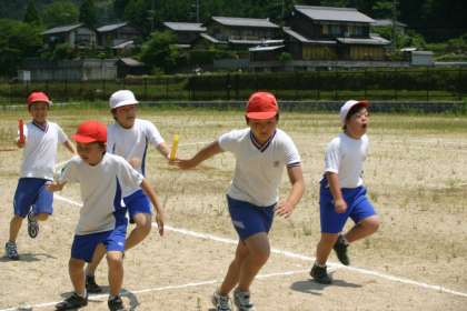 4グループ対抗のリレーをするために,6年生が5年生にバトンパスのポイントを教えたりして,頑張っています。