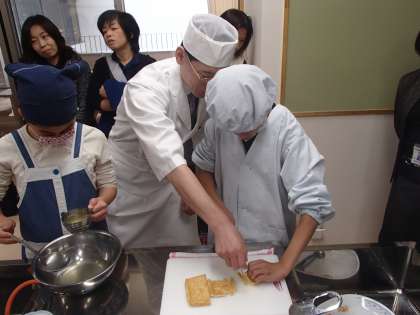 5,6校時に日本料理アカデミーの料理人さんに来校していただき,食育授業を行いました。五感を使ってだしを味わい,だしのうま味を生かした煮びたしを作るという学習を通して,日本料理の良さや工夫について考えました。