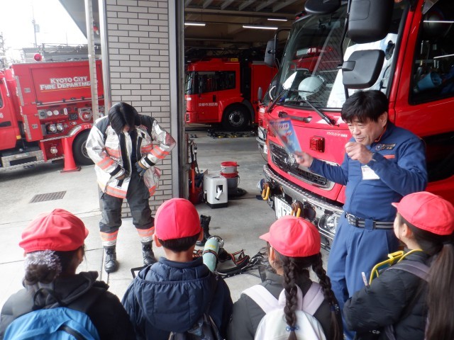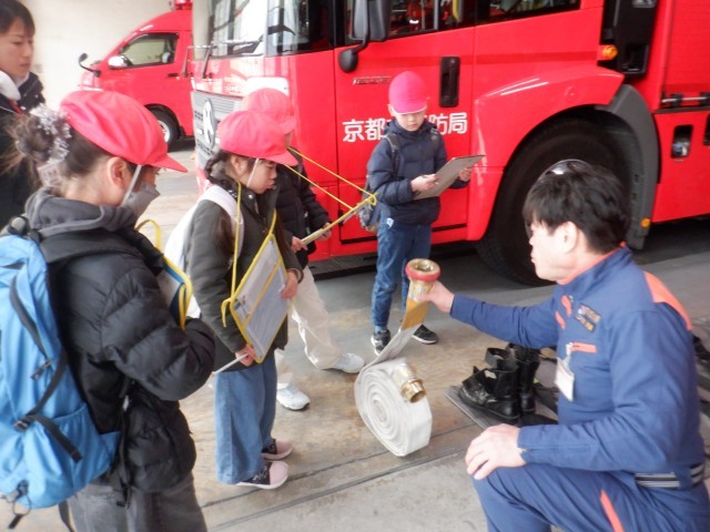 社会科「火事をふせぐ」の学習で、左京消防署を見学させていただきました。普段はあまり見ることができない場所や、消防士さんが訓練している様子などを見ました。実際にホースや防火服を持ってみると、「重い!」「これを着て走るとかできない!」など、驚きの声が上がっていました。
