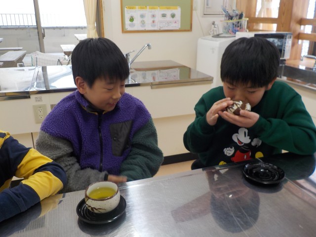 4年生は、社会科の学習で宇治のお茶について学習をしました。今日は、学習の最後に実際に宇治のお茶(煎茶)を味わいました。お茶の香りに子どもたちはうっとり!少し苦みを感じた子もいたようですが、お茶の良さを味わうことができました。