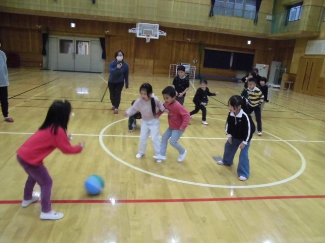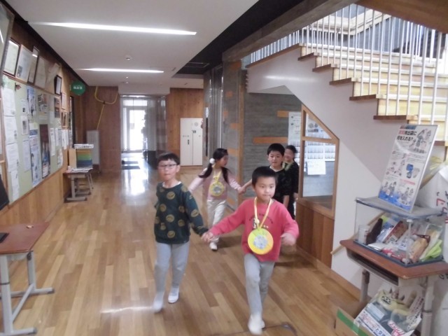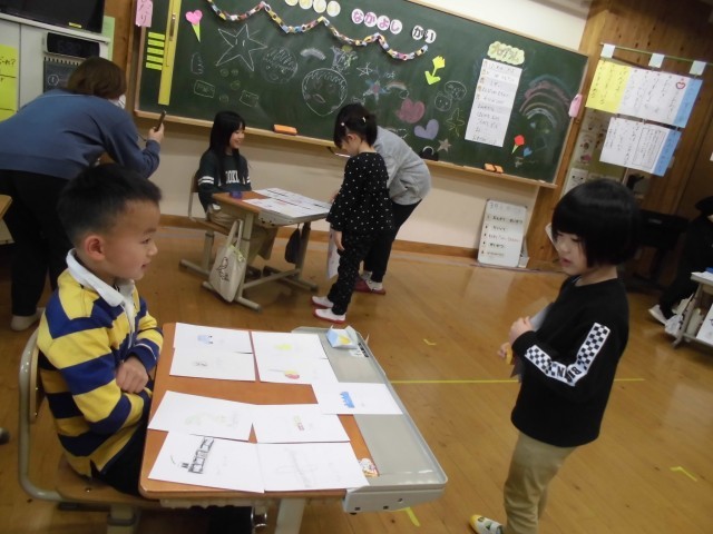 今回は1年生が生活科の学習でプログラムを考え、小学校に招待し、年長児にやさしく学校生活のことを教えたり、楽しく遊んだりしていました。