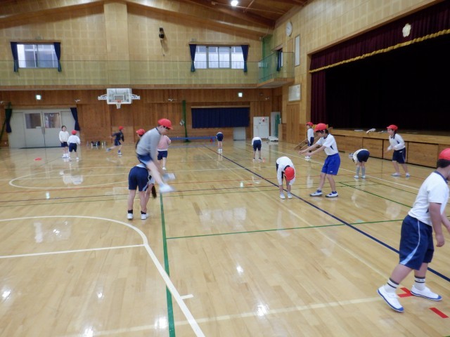 体育の授業が始まりました。「体ほぐしの運動」ということで、体の調子を整えたり、仲間と交流したりします。