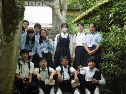 6月6日(火)広島県廿日市市立宮島学園の9年生が修学旅行で大原を訪れ、京都大原学院9年生と交流しました。大原学院の9年生は3年前、発見旅行で宮島学園を訪れています。その際、今の宮島学園の9年生と交流させていただきました。今回は3年ぶりの再会になりますが、先日、テレビ会議システムで交流したので、今日はお互いすぐに打ち解け、話を弾ませていました。全体の交流の場面ではアイスブレーキングのあと、宮島学園から宮島の固有の生物についてのプレゼンテーションがありました。その後、両校9年生は三千院方面と寂光院方面に分かれそれぞれの寺院を案内、それぞれの場所でお話も聴かせていただきました。お別れの場面では「また会おうね。」という言葉を交わしている生徒もいて、この出会いが彼らの今後の人生につながっていくことを切に願います。