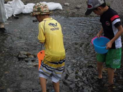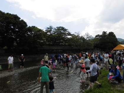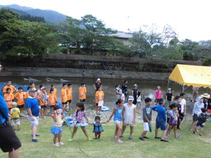午後1時川遊びフェスタが始まりました。まず、魚つかみ大会のルール説明があり、年齢順のグループにわかれました。魚(アマゴ)が放流されると、子どもたちはおおはしゃぎで魚を手づかみで取っていました。学院生がマイクで魚の取り方のコツなどを説明してくれていました。