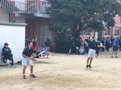 そんな光景が見られたのが、今回の秋季大会でした。女子初級の部、3人しかいない女子部員の中で、ベンチには8年生のキャプテン一人と顧問の先生。そこに練習試合で親しくなった衣笠中学校のソフトテニス部員が応援に来てくれました。試合中、大きな声で励ましてくれる衣笠中学校の生徒たち。結果、全市大会2回戦勝利。試合後衣笠中学校の部員から「おめでと〜」と声をかけていただきました。