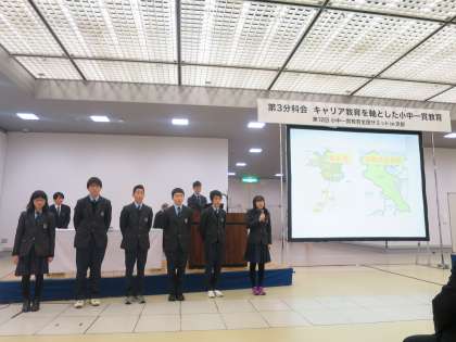 1月26日小中一貫教育全国サミット京都大会では、分科会の一つを任された本校の発表に8年生が登場しました。学校紹介の冒頭「♪京都 大原 三千院」と『女ひとり』を400人超の観客を前に歌う児童生徒会長。その後、学校の成り立ちや特長をしっかりと語る8年生たち。学校目標である「大原のゆとりある心を自信をもって伝えられる子に!」を目の前で実証している8年生の「堂々とした声」に、多くの方から拍手をいただきました。圧巻は、講評される先生からPISAの学力観の説明の際、突然質問されたことです。「音と光とどちらのスピードが速いですか」いきなり当てられたその子は「光です」とすかさず的確に答えていました。事前に用意されていた発表だけでなく、とっさの対応ができる8年生のコミュニケーション力に、また大きな拍手をいただきました。