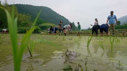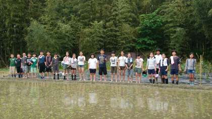 5月18日(金)中期ブロックのみんなで田植えをしました。先日,代かきをした田んぼに「ころ」を使い列に沿って正確に田植えをしました。少し暑い中,田んぼの水がとても心地よかったです。学院生は「去年よりもたくさん収穫できるといいな。」「ちゃんと世話をしていこう。」など,自分たちの植えた苗を笑顔で見ていました。引き続き中期ブロック全員で協力して田んぼと苗の管理をしていきます。京都大原学院では年間を通して地域の方にお世話になり,お米や野菜を育てることで,学院生は着実に地域の農業文化を継承し,地域のお米への誇りと愛着の気持ちを育んでいます。