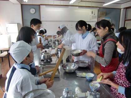 中期ブロックでは、1月25日の総合の時間に、収穫したもち米を用いてもちつきを行いました。5年生〜7年生で協力しておいしいお餅が出来上がりました。できあがったお餅は、収穫した大根で大根おろしを作って“おろし餅”にしていただきました。