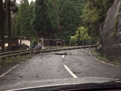台風通過の夕方、道を遮る大木を大原消防分団の方々が切断してくれました。少し百井まで近づけました。しかし倒れた電柱はそのまま、どけることができません。道の続きは先が見えていてもつながりません。夜になって、百井から歩いて大原に降りてきた人がいました。様子を聞くと、「倒れた電柱の先も、道にはたくさんの大木が倒れ、木の枝が落ちている」と言われました。明日の百井登山は、中止せざる得ません。