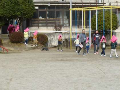 1月17日(金),朝会,ふれあいタイムの後,避難訓練を実施しました。初めに,教室で地震の災害や地震発生時の避難方法を学習しました。その後,“地震が発生した後,火災が起きる”という想定で避難訓練を行いました。緊急地震速報を受けて,教室で一次避難行動をとり,放送の指示で運動場に避難しました。