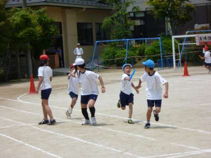 6月4日(土)運動会 プログラム11番 「色別リレーA・B」です。全員が4つのグループに分かれて競います。午前の部はA・Bのリレーをしました。みんながんばって走りました。午後の部C・Dも楽しみです。
