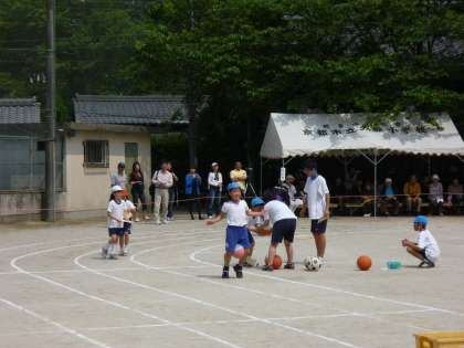 6月4日(土)運動会 プログラム17番 前期B(3・4年)の「大原オリンピック」です。ハードルを3台とびこえ,平均台を渡り,くじを引いて,ボールをまたにはさんでとぶか,けっていくか,ドリブルでいくか,ざるで運ぶかを決めました。最後にゴムをまたぎこえて「大原オリンピック」ゴールイン。