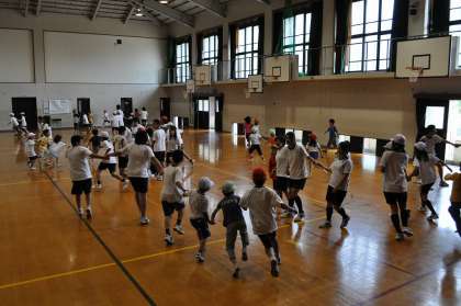 6月14日(火)昼休みに,体育館で児童生徒集会を行いました。1〜9年生が集まり,みんなで遊びました。手つなぎ鬼をしました。8・9年生の報道委員3名がスタート鬼でした。それから鬼の輪がどんどん拡がり,みんなの手がつながっていきました。鬼につかまらないように,みんなめいっぱい体育館内を逃げ回っていました。