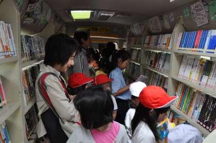 子どもたちにも大人気です。毎月こじか号がくるのを心待ちにしています。前月に借りた本をいっぱいかかえて子どもたちが中間休みに集まってきます。また,本をいっぱいかかえて帰っていきます。子どもたちの間では,『巡回文庫』とよんでいます。