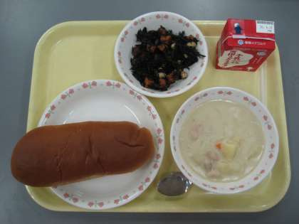 1年生も配ってもらった給食を前に「今日は大好きな物ばかりで早く食べられる!」と張り切っていました。しかし,食べ始めると「ひじき」「豆類」の苦手な学院生は少しずつ口に入れて,もぐもぐもぐ。なかなか飲み込むことができませんでした。時間は少しかかりましたが全て食べきることができました。苦手な物でも「食べよう」とすることで色々なことに取り組むことができる力が身に着くと思います。頑張れ,1年生!
