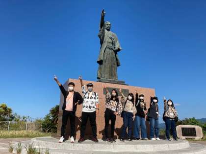 9年生は高島を散策し,高島炭鉱と深い関わりがある岩崎彌太郎の銅像まえで記念写真を撮りました。