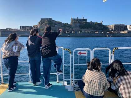 9年生はクルーズ船で軍艦島の周りを一周しました。スタッフの方から詳しい解説も聞くことができ、産業文化遺産の歴史を学ぶことができました。