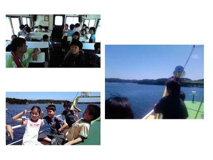 9日(土)第1日目 近鉄特急で,賢島駅に到着後,船でなかよし港に向かっています。英虞湾の真珠の養殖などをみながら船は進んでいます。船の2階からはとてもいい眺めです。子どもたちはみんな元気です。