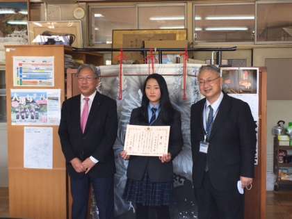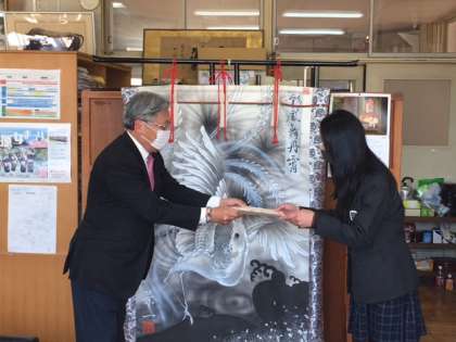 今日の昼休みに左京税務署から4名の方が来られて税の作文の表彰式がありました。例年なら左京区役所での表彰になるのですが,今年はコロナウイルス感染拡大防止のため,各校の校長室での表彰になりました。作文は「もし税がなかったら…」という題名で,左京納税貯蓄組合連合会長賞を受賞しました。おめでとうございます。