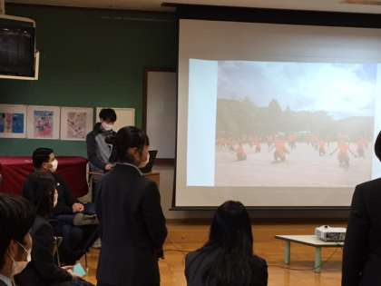 今日の5・6時間目,7・8・9年生は国際交流会館のプログラムで,グアテマラから留学されているガルシアさんと交流しました。はじめに8年生が学校の紹介を,9年生が大原の紹介をしました。