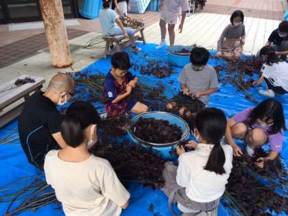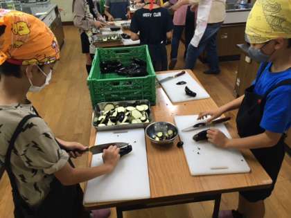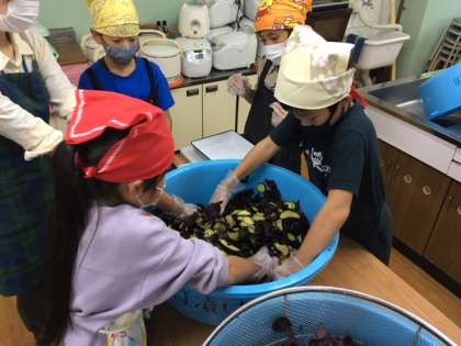 まず,赤しそを洗って,葉を取ります。つぎに,なすを切ります。それを塩でもみこんだあと,赤しそを加えてもう一度もみます。みんなで漬けたしば漬がどんな味になるか楽しみです。