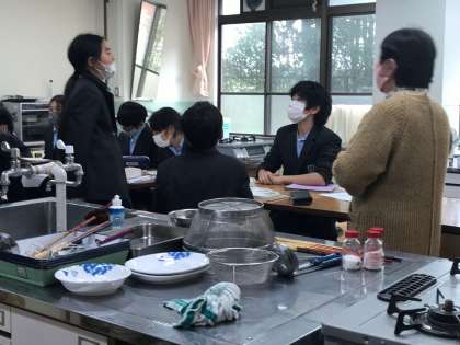 家庭科の授業で「ゆでる」調理をしました。ゆでた野菜のかたさが変わることや,色合いがよくなることに気づくことができました。(写真は,調理終了後に気づいたことを交流している場面です)。