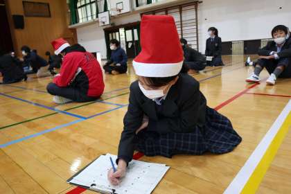 ルールは簡単!縦割りグループでしりとりをボードに書いていきます。クリスマスに関係のある言葉を書くことができたらポイントが2倍になりますが,自分の順番になると焦ってなかなか出てこないものです。クリスマスソングが流れている間にどれだけ沢山書くことができるかを競いました。