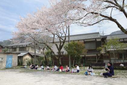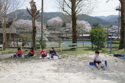 桜がきれいに咲いているので,お花見しながら昼食を取りました。5,6,7年の学年にそれぞれ分かれ,一列に並んでお弁当を食べました。とってもいい天気で,日陰でないと暑いくらいでした。風が吹くとひらひら花びらが舞ってきれいでした。体力テストで疲れていましたが,美味しいお弁当を食べて,みんなも笑顔でした。食事後は,桜をバックに記念撮影を撮りました。